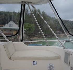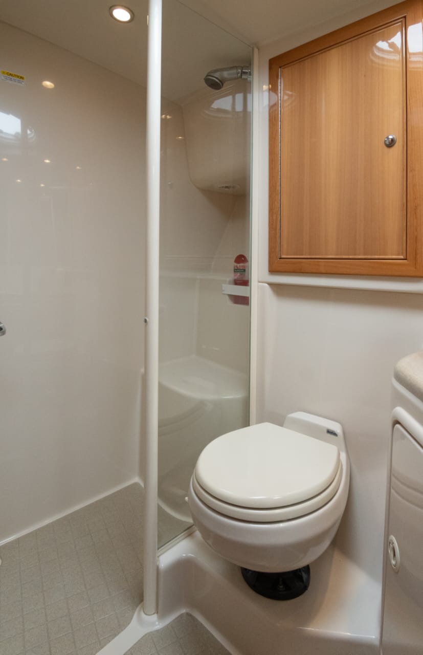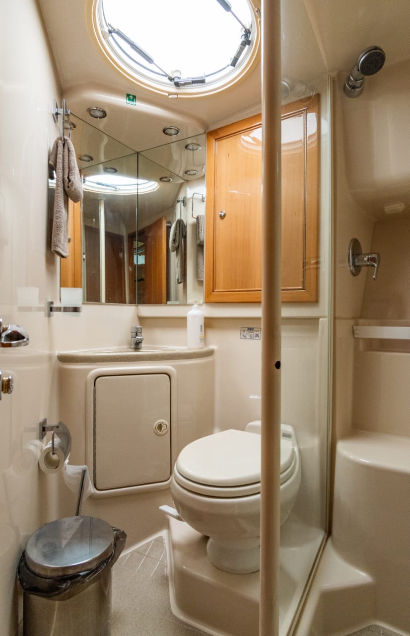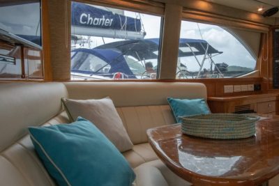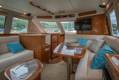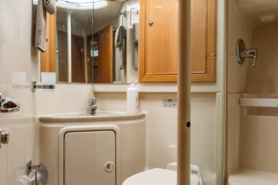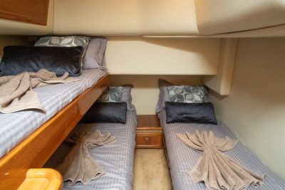 The Riviera 48 Open Flybridge model a luxury cruiser that offers guests the option of an enclosed or open flybridge. As well, two well-equipped bathrooms and 2 bedrooms. The standard layout provided for a master stateroom with double bed aft facing. On starside a forward facing guest cabin and pullman-style 3 bunks. The galley included a two-burner electric cooktop, single sink, microwave and fridge. A servery separated the galley from the port side L-shape dinette. The vessel has masses of space inside and out, Her spacious interior boasts a well-equipped galley, full bathrooms with showers, and plenty of seating to relax in air-conditioned comfort. Up on deck, you’ll find an enclosed flybridge to take in the view and acres of deck space fore and aft to sunbathe or fish the day away.