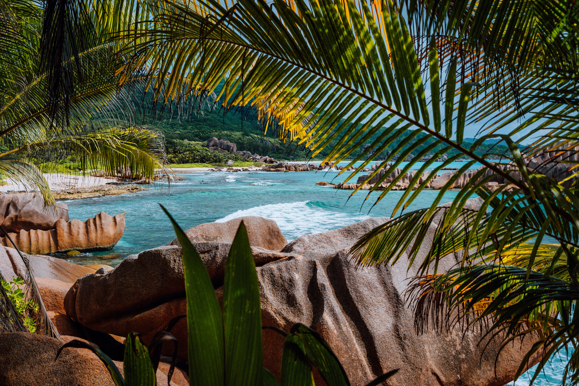 Tropical secluded beach framed by nature foliage on the trekking tour through the jungle to hidden Marron beach, La Digue, Seychelles.