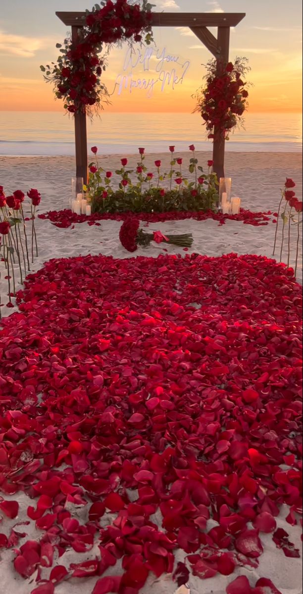 “Marry Me” written in petals on the sand